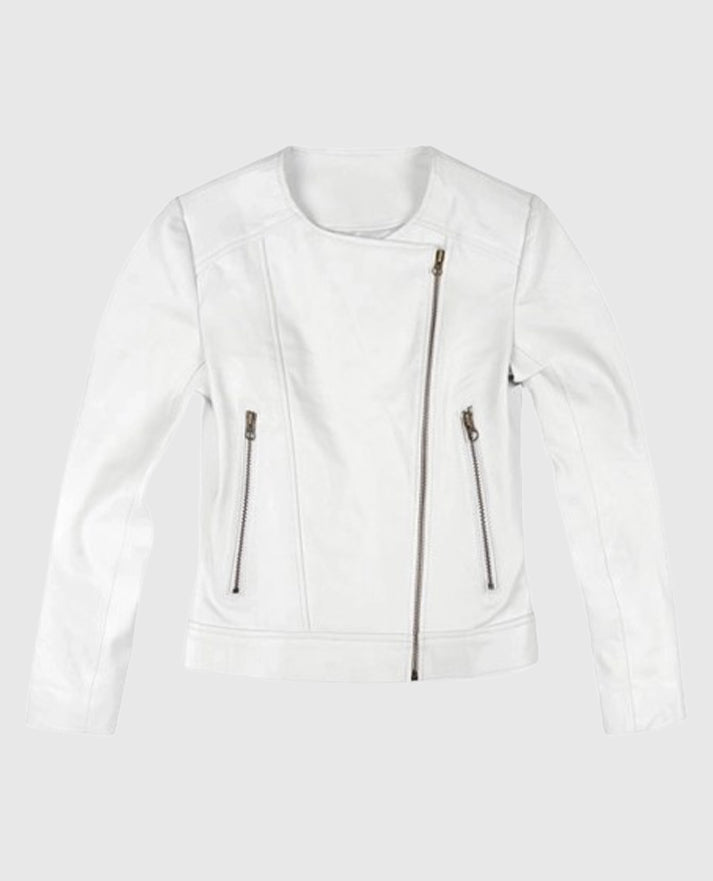 Women's Round Neck White Biker Leather Jacket